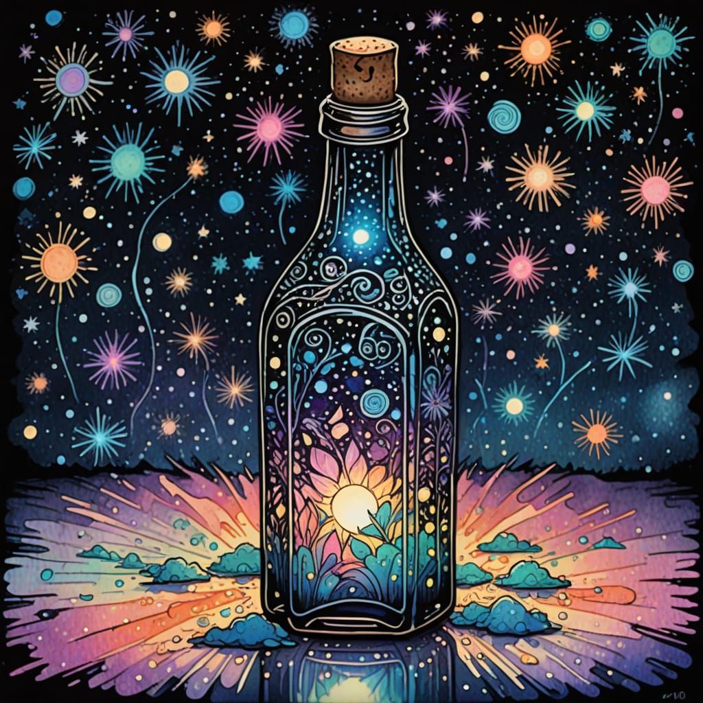 This digital artwork features a glowing bottle filled with starlight, rendered with India ink linework, dry brushing, and iridescent highlights. Features pastel colors and soft lighting.