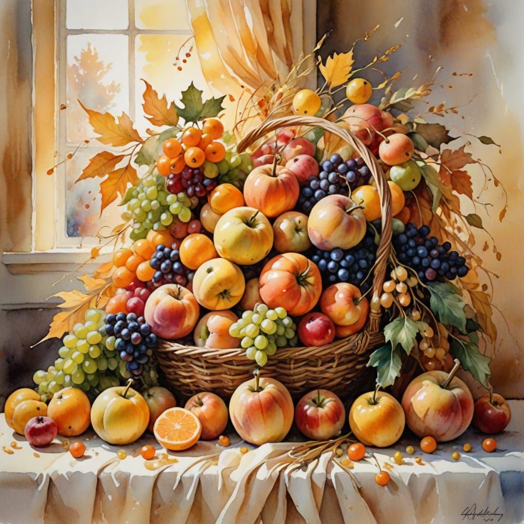 This watercolor painting captures a cornucopia overflowing with fruits and vegetables, radiating a warm, golden light to symbolize gratitude and the harvest season.