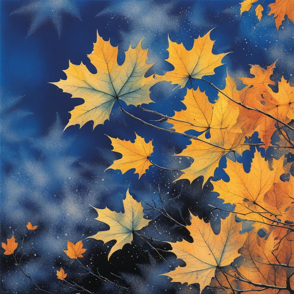 This image shows autumn leaves falling during the first frost, rendered as a blue ink drawing with splatters and drips. It is in the style of vintage ink art.