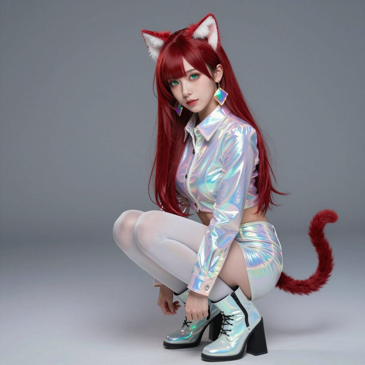 This image features a Japanese woman with long red hair, green eyes, cat ears, and a tail. She is dressed in a striking iridescent outfit, including a shirt, pants, and boots, complemented by matching earrings.