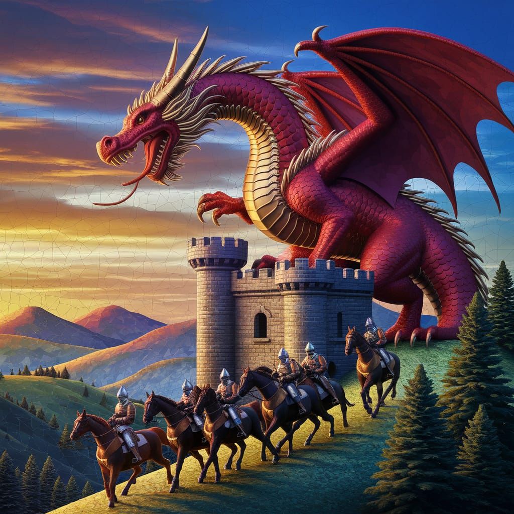 This image depicts a fantasy landscape under a golden sunset, featuring a colossal red dragon atop a medieval castle tower, surrounded by armored knights and rolling hills, reminiscent of Kinuko Y. Craft's style, with dynamic lighting and rich colors.