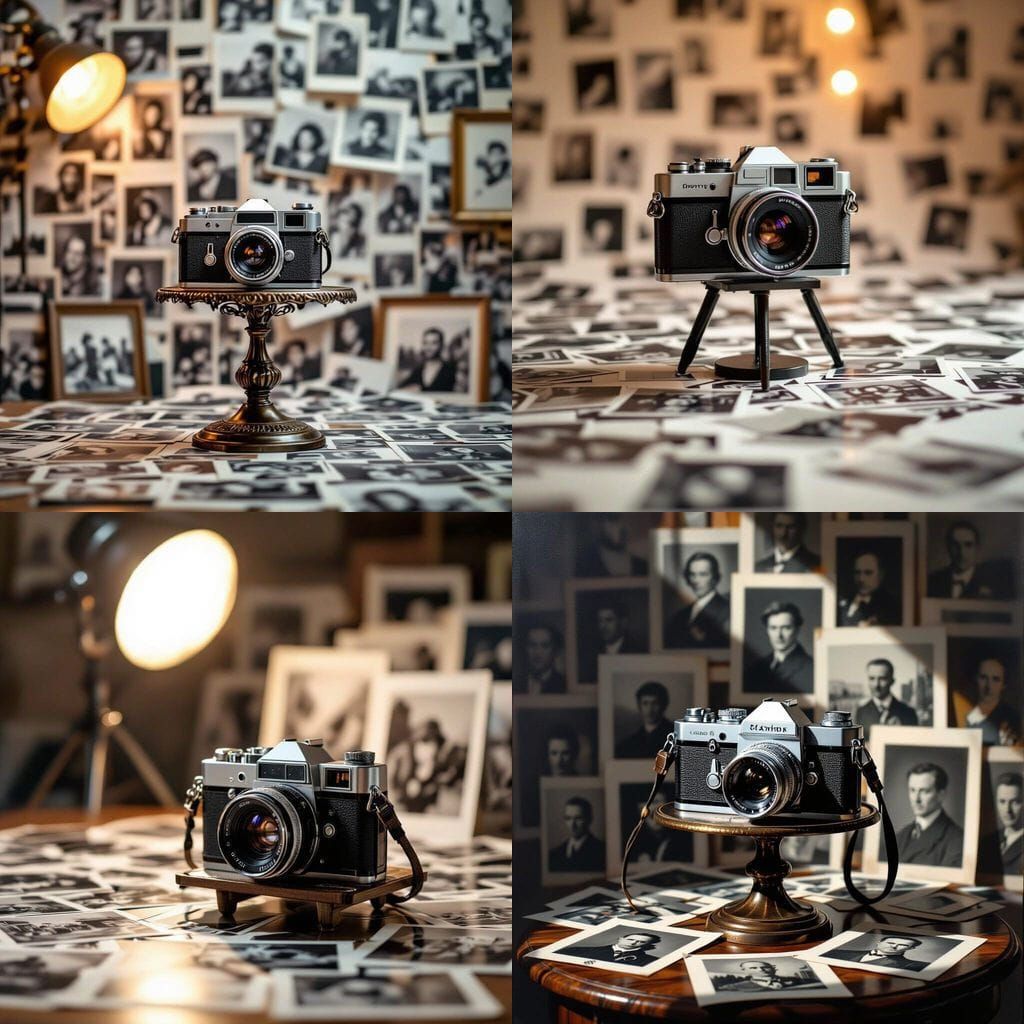 This image showcases a classic camera placed on an elegant stand, surrounded by a vast collection of monochrome photographs, creating a nostalgic display.