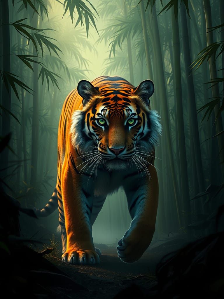 This image captures a serene yet intense moment of a tiger's nocturnal hunt, set amidst a misty bamboo forest. The tiger's striped fur blends with shadows, while its piercing eyes gleam with primal intensity in a cinematic atmosphere reminiscent of dark, mystical realism.