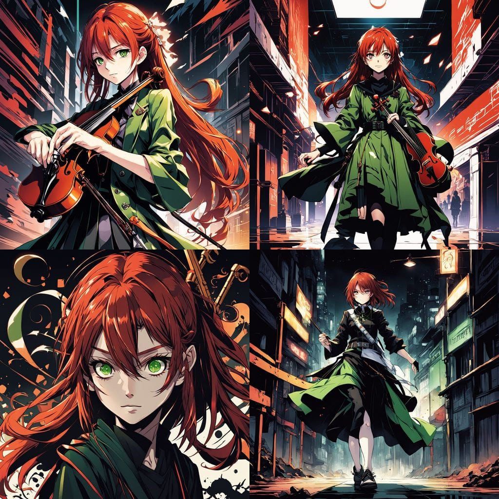 This anime-inspired image captures a striking half-Japanese teenager with red hair and green eyes, dressed in goth attire, set against a cinematic backdrop
