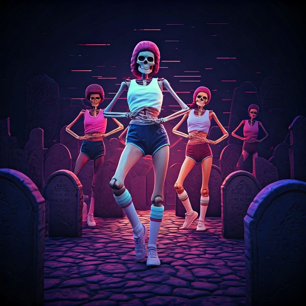 This digital illustration depicts skeletons in 1980s gym clothes like shorts and leg warmers, doing aerobics near cemetery tombstones. Features dynamic lighting and a glitchcore aesthetic.