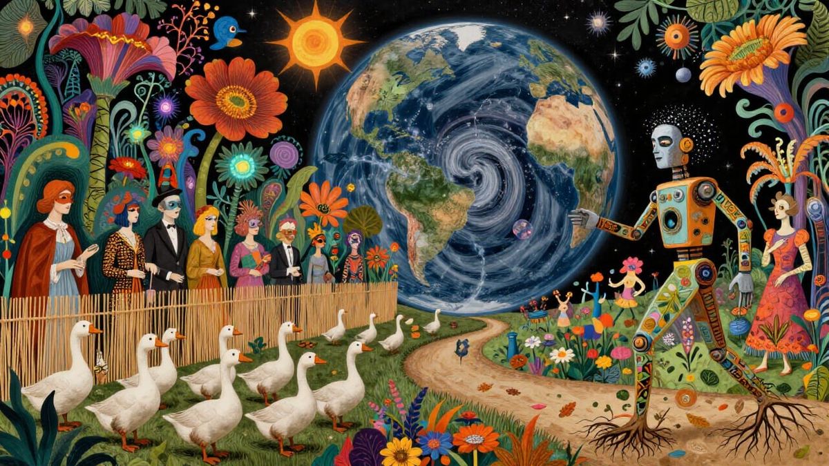 This image depicts a surreal garden party with guests in costumes, bioluminescent flowers, and dreamlike creatures, rendered with autumn paper collage techniques and eco-art elements.