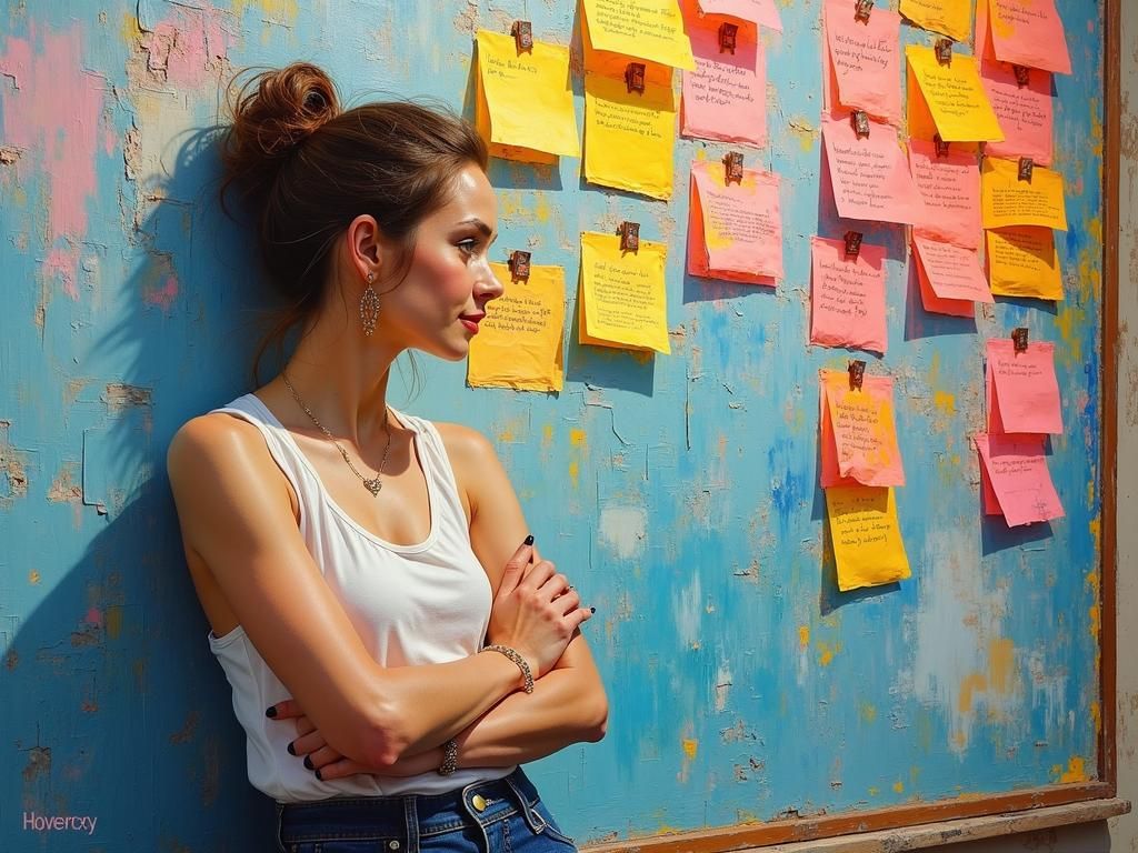 A vibrant impasto painting of a woman in an office with a Kanban board. The artwork uses textured brushstrokes and blended oil and acrylic paints, reminiscent of post-impressionism.