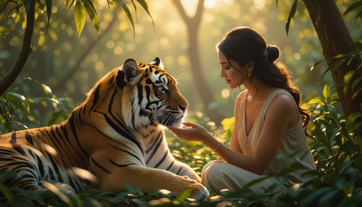 A serene woman shares a moment with a majestic Bengal tiger in a sun-dappled park. Golden hour light creates dramatic shadows and highlights textures. Cinematic film still with film grain and color grading.