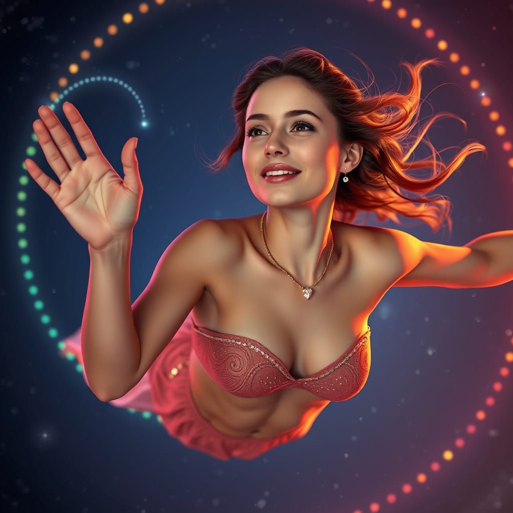 A stunning hyperrealistic image of a young woman in mid-air, surrounded by a vibrant rainbow and set against a starry night sky. Her soft, glowing skin is adorned with sparkling jewelry, as she creates a delicate, swirling pattern in the air with her fingertips.