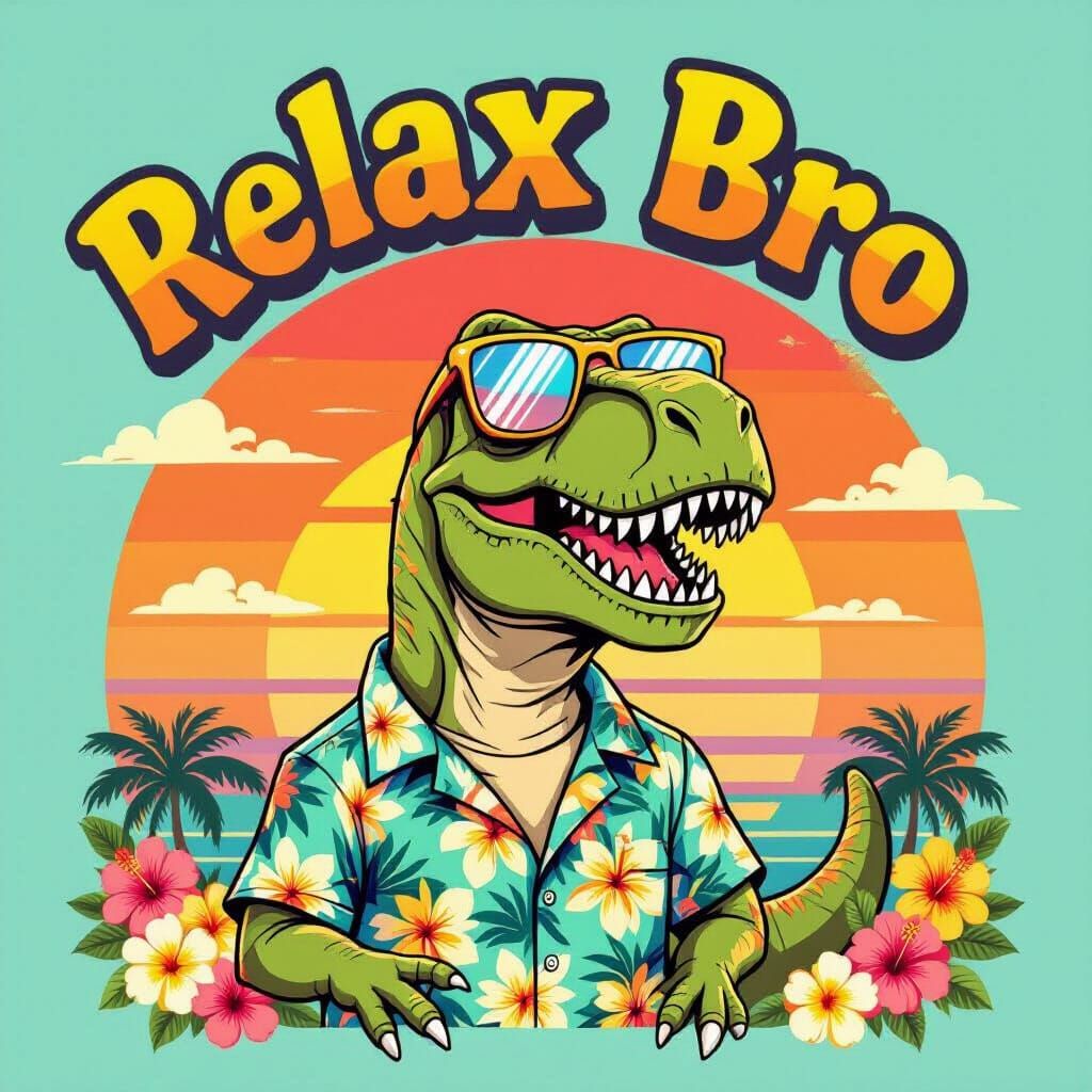 A vintage-inspired t-shirt design showcases a cartoon Tyrannosaurus Rex affectionately nicknamed "RELAX BRO" with a wide, genuinely cheerful smile. The dinosaur is depicted wearing a vibrant frangipani-patterned Hawaiian shirt and oversized, reflective mirrored sunglasses, exuding a carefree confidence as it gazes slightly to the viewer’s left. Behind the T-Rex, a stylized tropical sunset unfolds, featuring a gradient of orange, pink, and purple hues blending into a soft, teal sky dotted with fluffy, cartoonish clouds. Arching above the dinosaur's head, the words "RELAX BRO" are displayed in a groovy, 70s-style font with a subtle drop shadow and a few scattered hibiscus flowers are artfully placed to add to the relaxed, summery vibe.