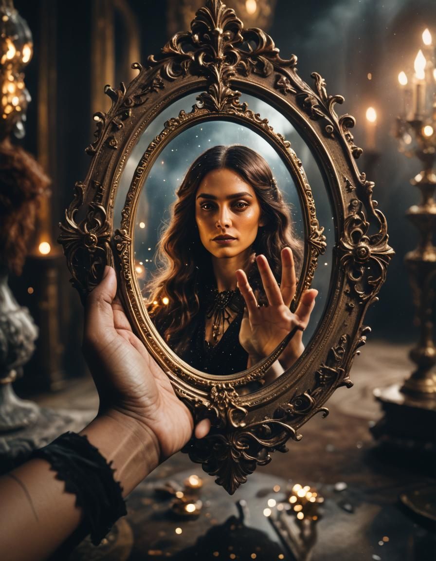 This image shows a close-up of a young woman holding a golden Victorian mirror. The reflection in the mirror reveals a brown-skinned witch, set against a dark and atmospheric backdrop with sparkling particles.