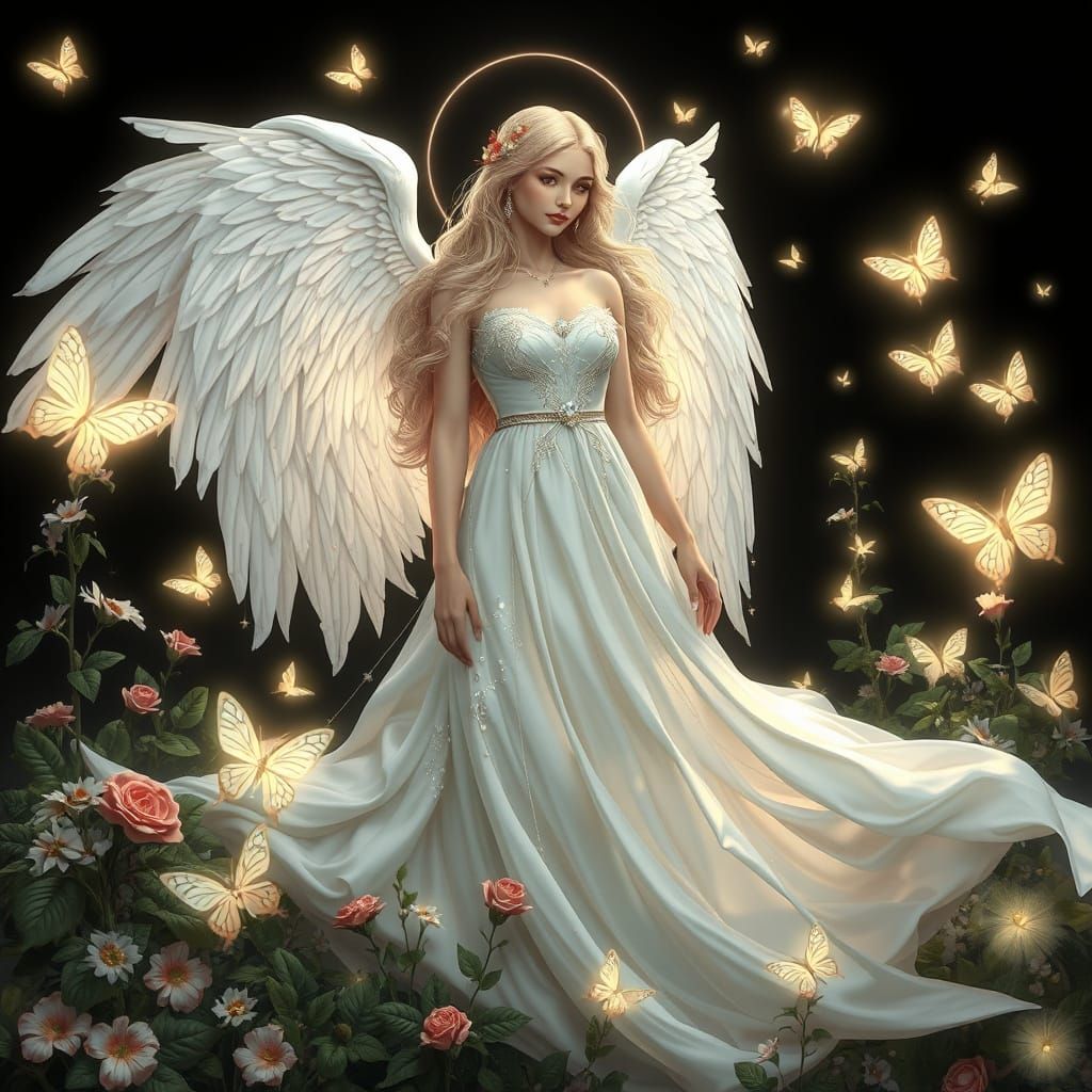 A 4K ultra-detailed high-definition render illustration of a stunningly detailed and artistic representation of an Angel. The Angel is clear white and has glowing wings and is wearing a white dress adorned with pearl, white and pink flowers, and small diamonds. Her long, flowing hair is a blend of blonde ...