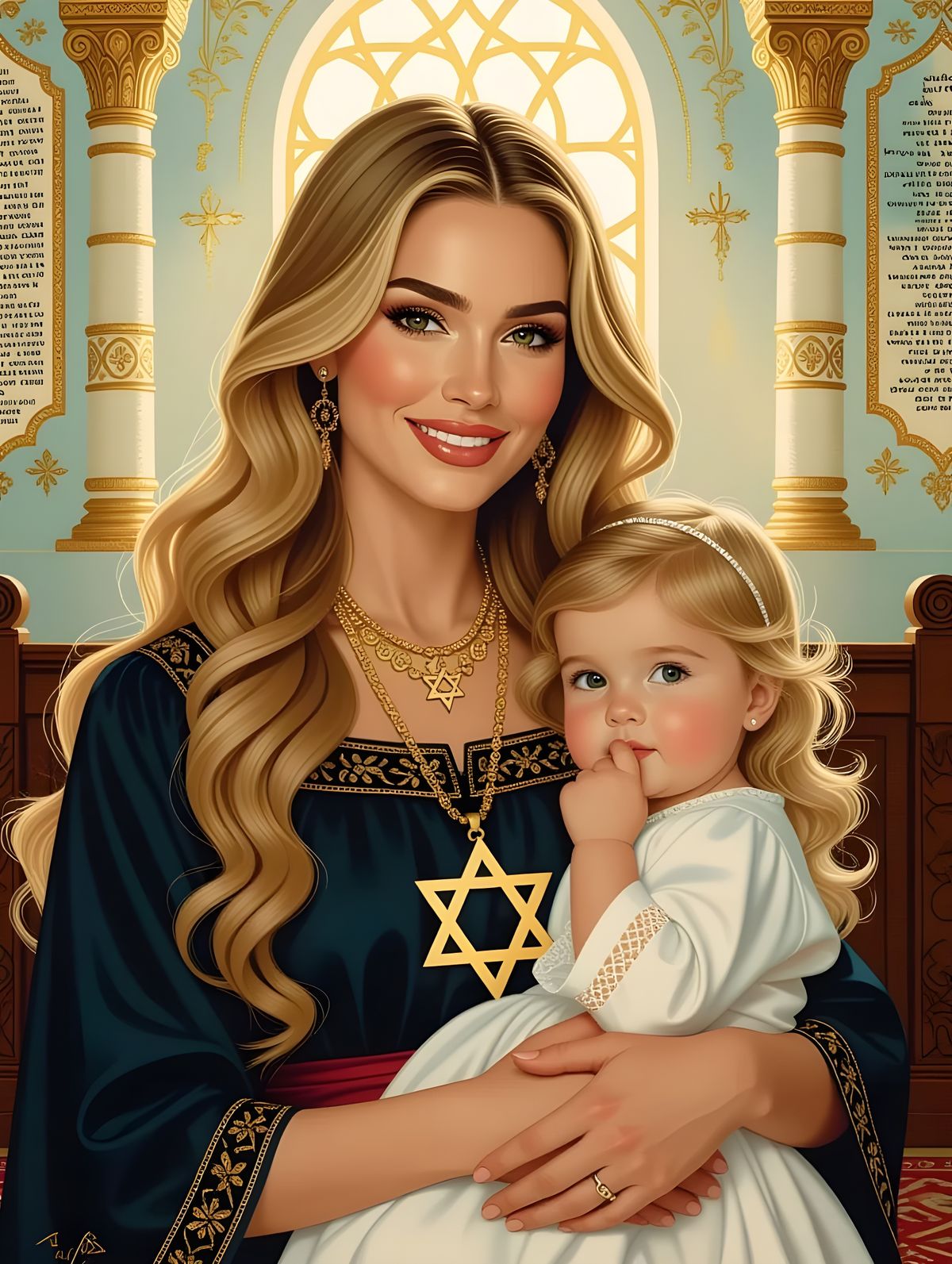 This heartwarming image captures a serene mother and child moment in a traditional Jewish temple setting, with the mother cradling her 9-month-old baby and gazing lovingly at her, surrounded by the sacred atmosphere and symbols of Jewish faith.