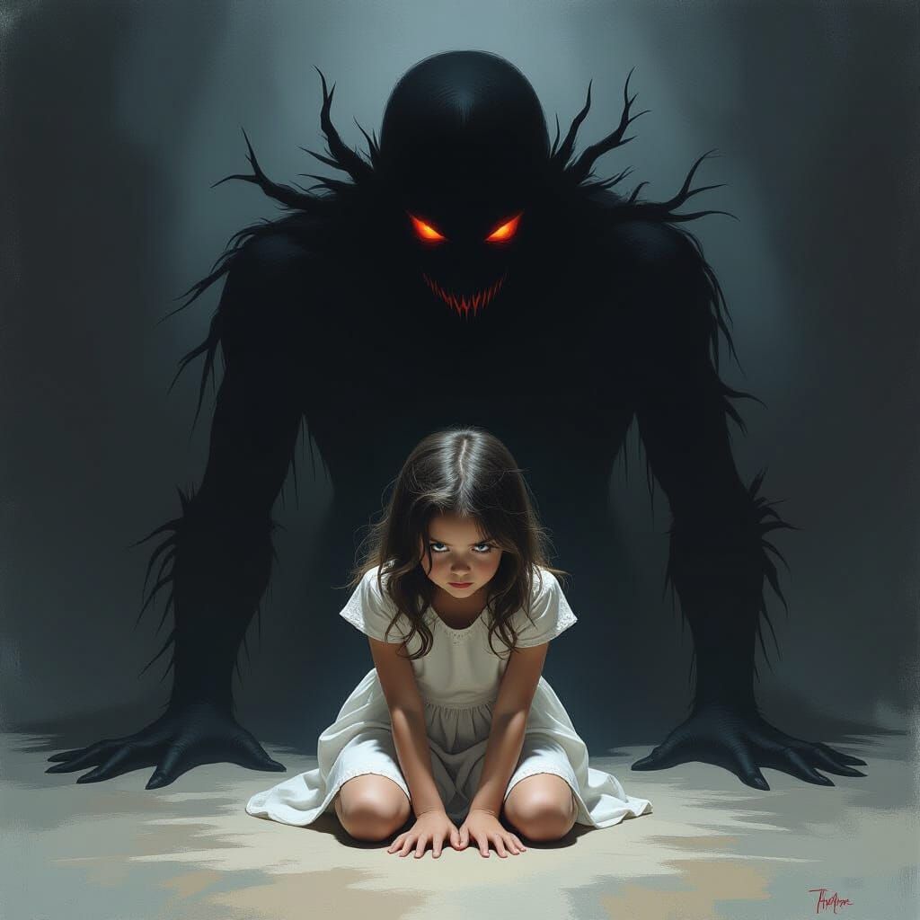 This image depicts a child overwhelmed by fear. The scene is filled with shadows and a looming presence, rendered with dark fantasy and surreal elements.