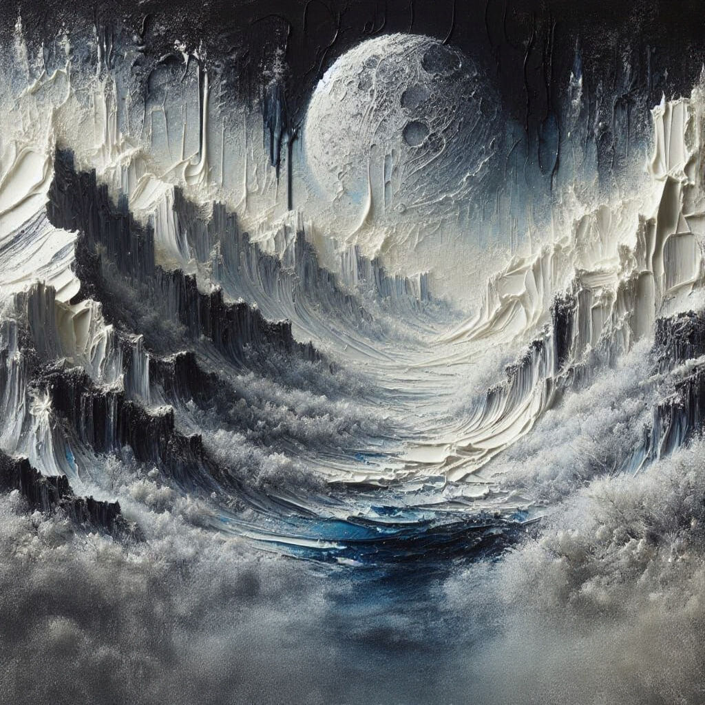 A winter-themed landscape interpretation of Valle de la Luna. The image seemingly comes to life as thick, visceral texture paste and white glue are generously spread over a blank canvas. The paste is deeply textured, creating a tactile experience. Rich oil paint drips, creating an impression of sublime ...