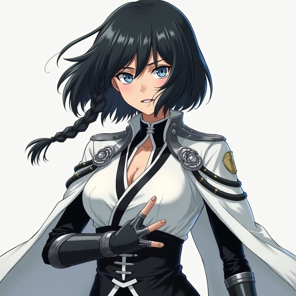 This image shows a fierce young female warrior with a bob cut, braided black hair, and silver eyes. She is wearing a white and black uniform with gauntlets.