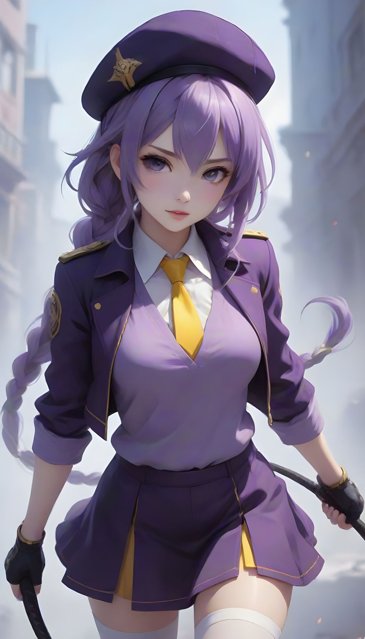 This image shows a girl with long braided hair in a dark purple and white outfit, wielding a whip. The character is set against a detailed background of a ruined city.