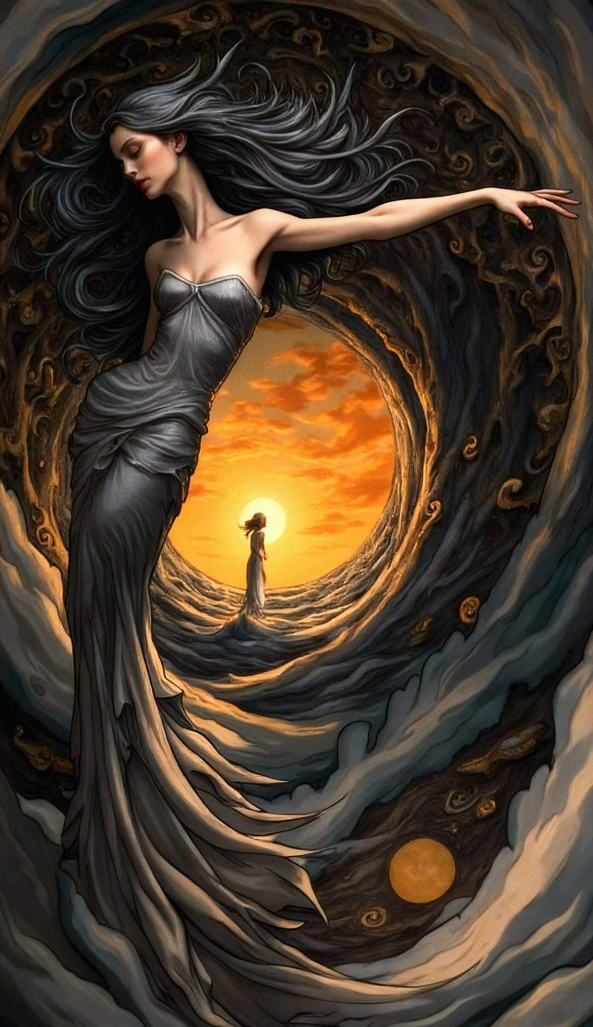 This image shows a woman in a flowing white dress on a cliff overlooking the ocean. Inspired by classical landscape painting with intricate, decorative details.