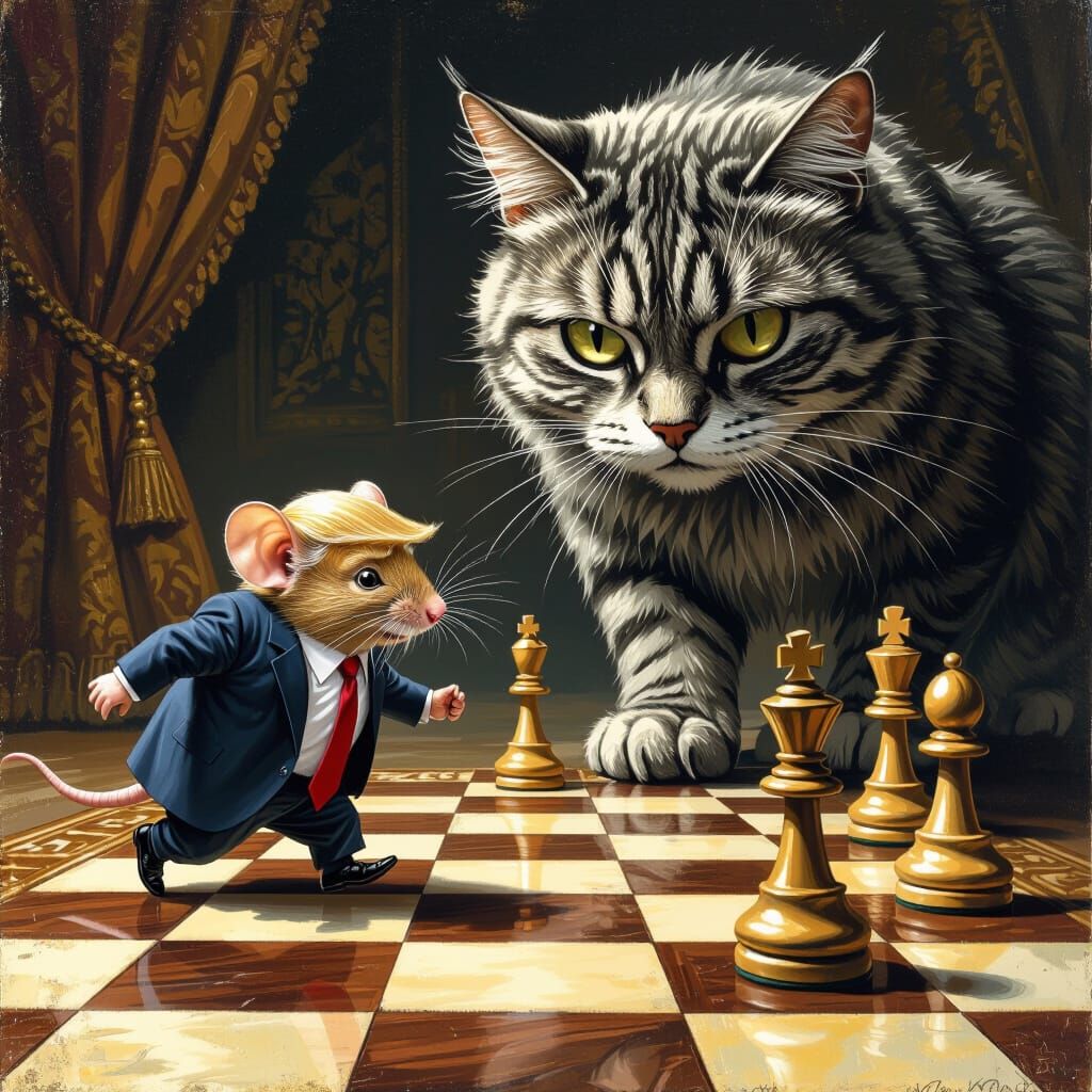 This image shows a tiny mouse in a suit, representing a former president, scurrying across a chessboard, chased by a large, menacing cat embodying another world leader. The image blends satirical, whimsical, and realistic styles.