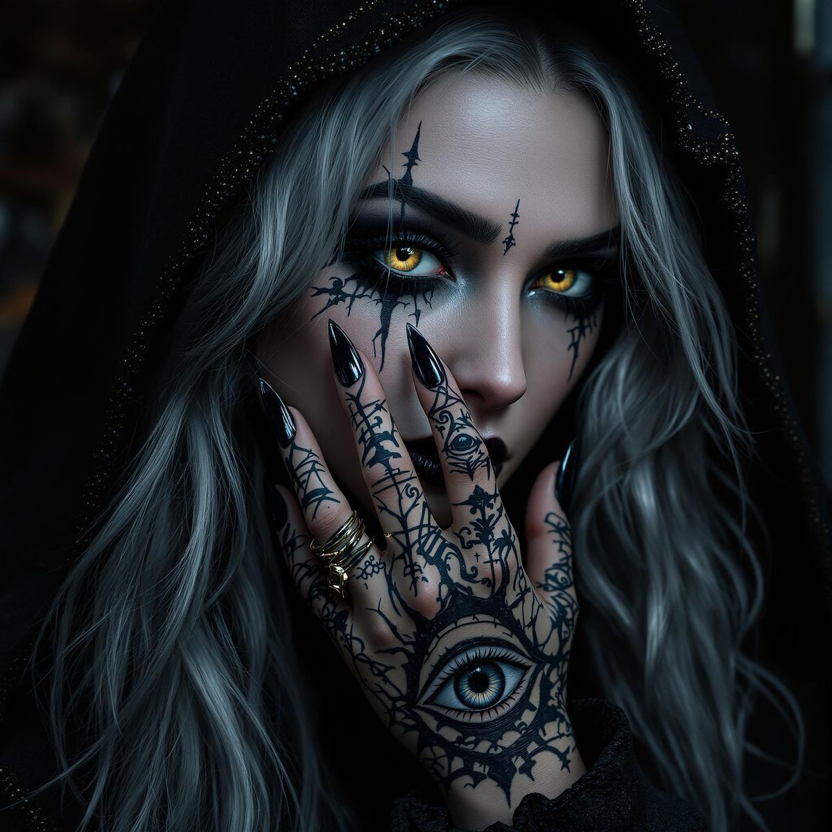 A photorealistic image of a woman with long gray hair and dark attire, featuring a striking hand tattoo with a large, detailed eye, surrounded by cinematic lighting and intricate dark makeup.