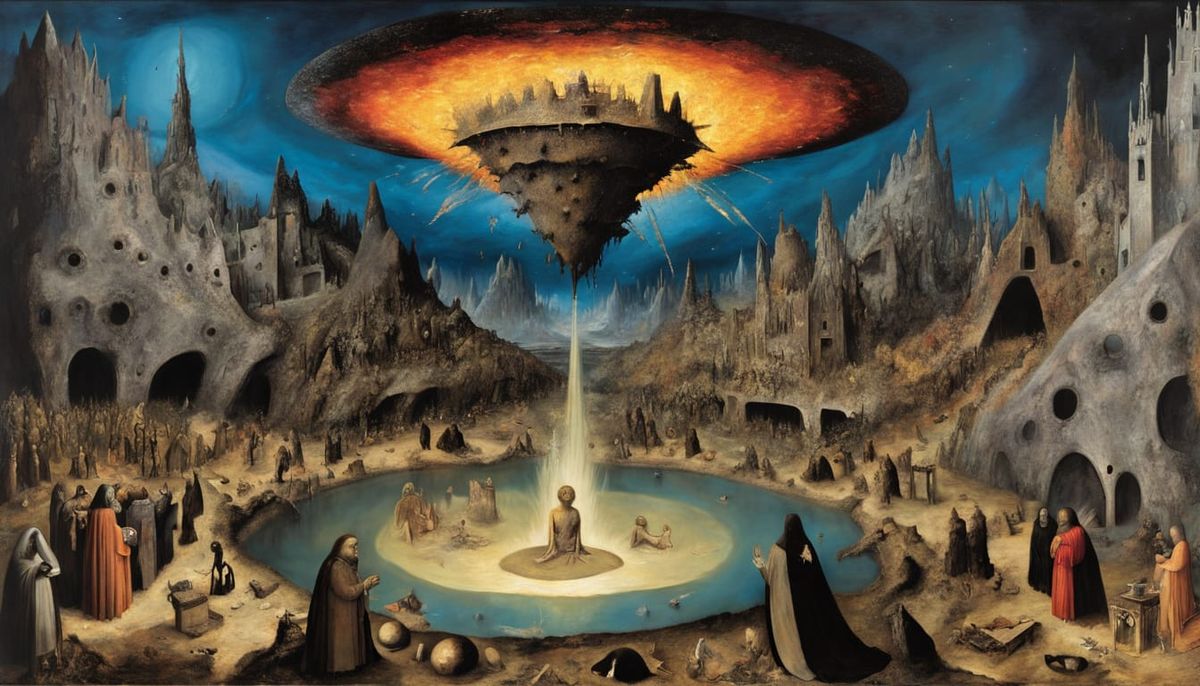 This image is a Renaissance-inspired horror painting featuring a glowing aura and an unholy baptism scene, created with acrylic art and sci-fi elements