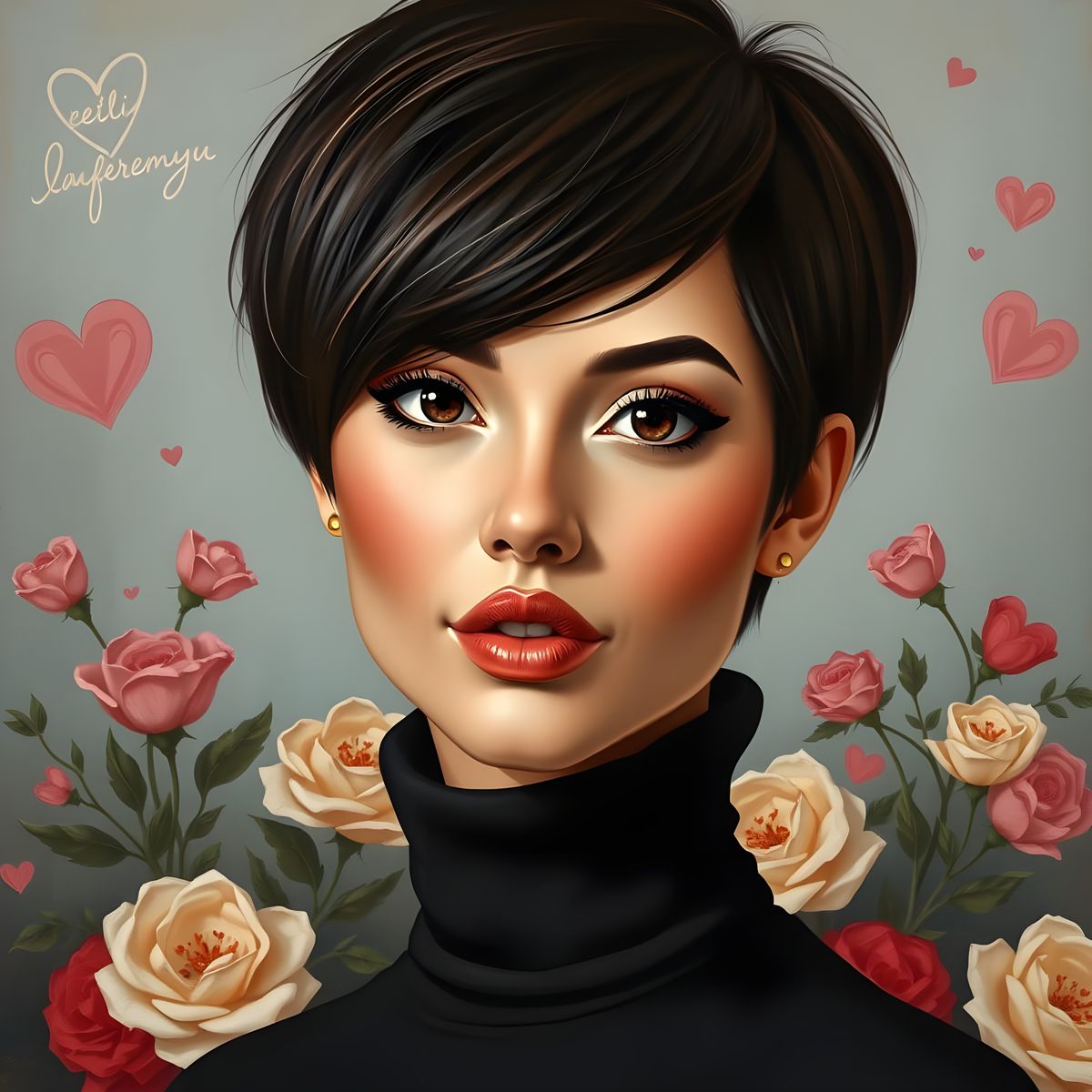 A striking picture of a beautiful brunette woman with a pixie cut, wearing a black turtleneck. The modern oil painting features a background adorned with flowers and hearts.