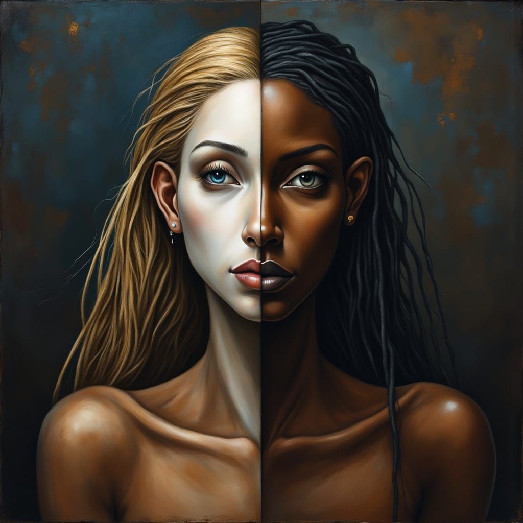 This image shows a surreal portrait of a Black woman with a split face. One side features Scandinavian traits, the other Somali, set in Venice. Guache-inspired textures and dynamic lighting create a moody, abstract scene.
