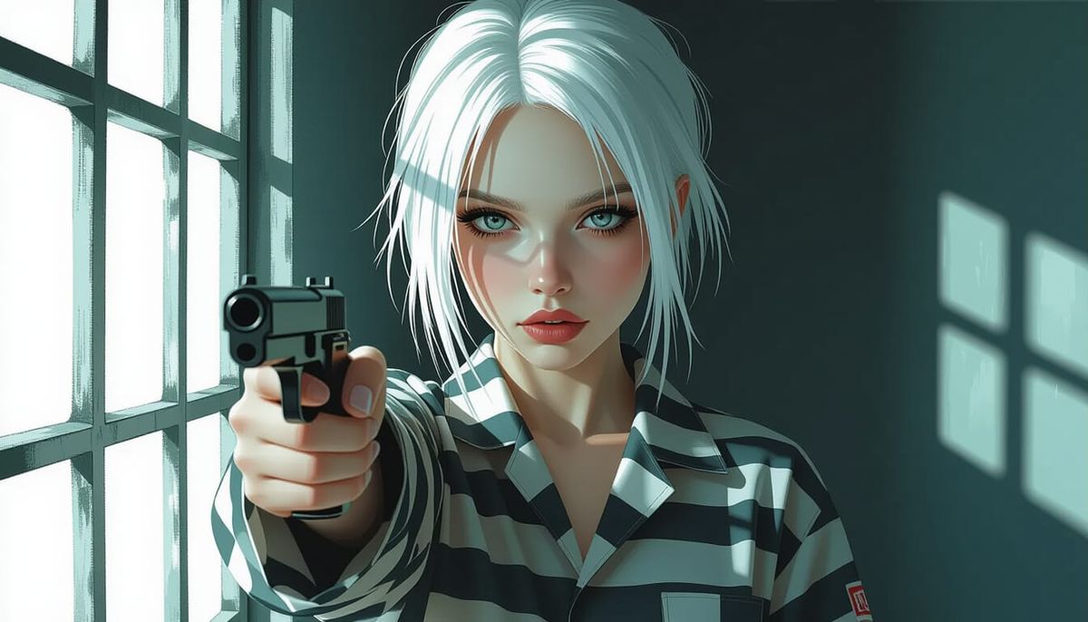 This image shows an albino woman in a prison suit playfully aiming a finger gun at the viewer. The digital illustration features cinematic lighting, dramatic shadows and hyperrealistic textures.