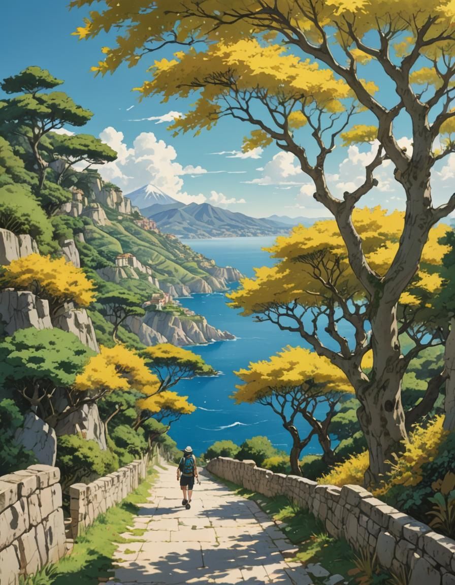 A Ghibli-style illustration of Mediterranean mountains meeting the sea. A distant view with blue sky, fluffy clouds, and a pathway leading to a large tree with yellow leaves. A boy in a blue cap walks along the path.
