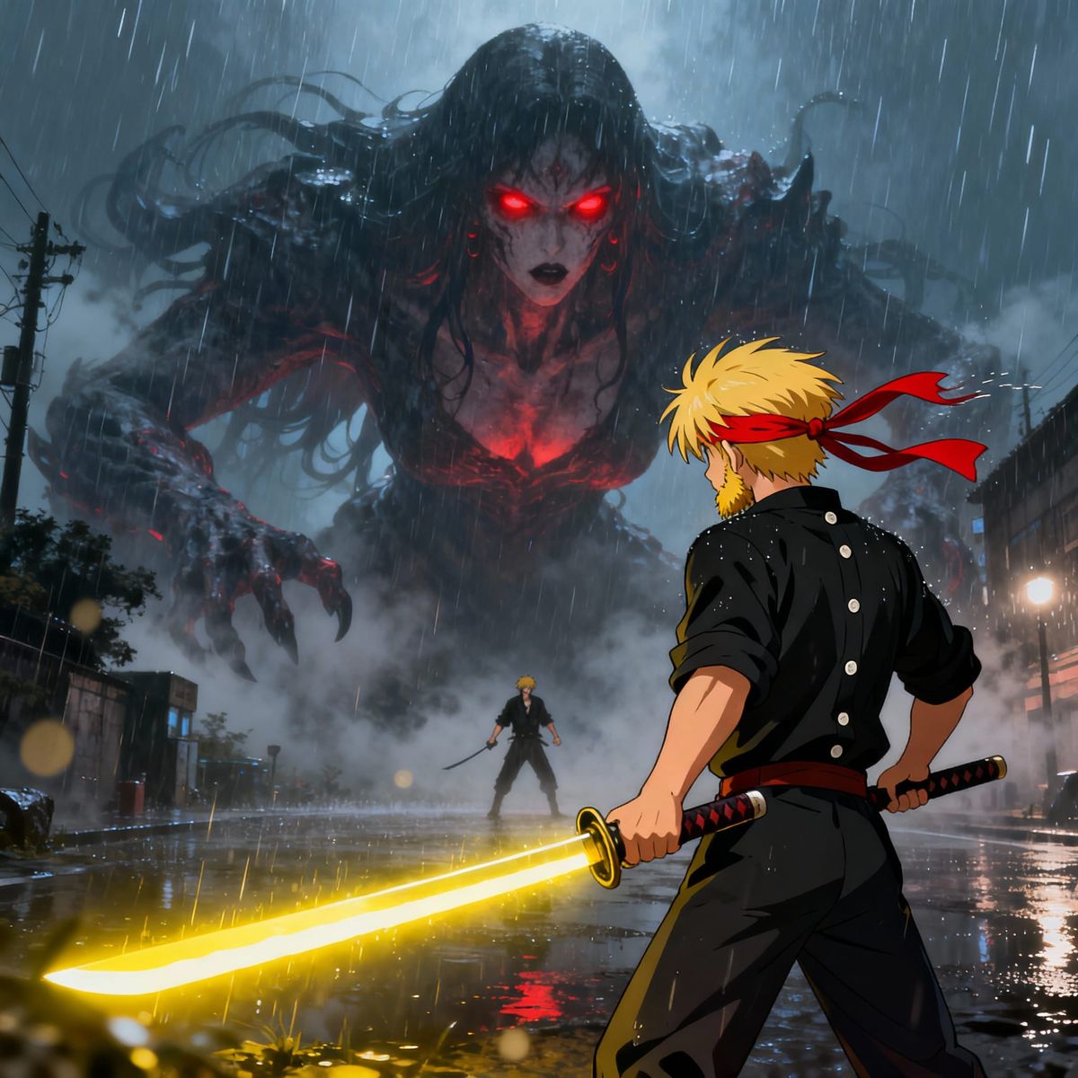 This image depicts an epic anime fantasy battle scene. A blond warrior with a glowing katana stands against a colossal monster woman amid a rainy, cinematic atmosphere.