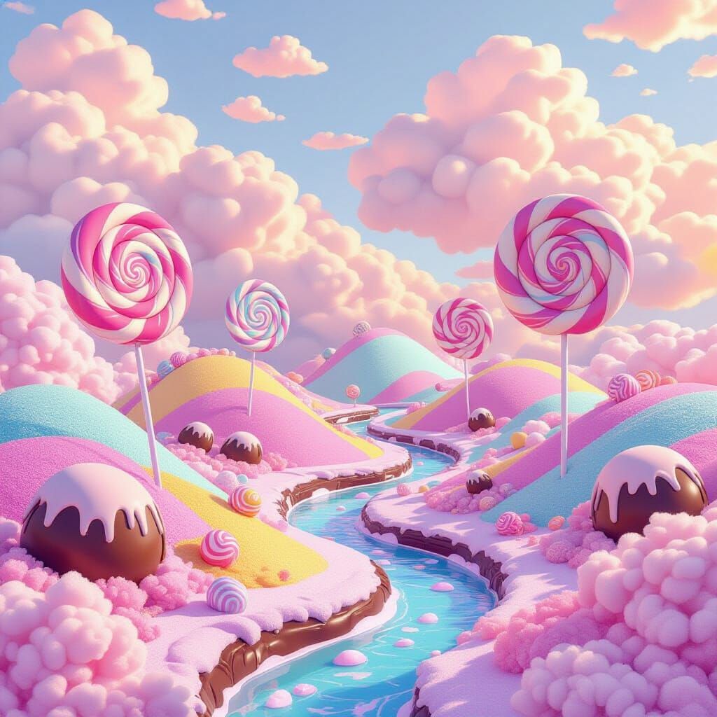 A vibrant candy world featuring giant lollipops, gumdrop hills, chocolate rivers, and cotton candy clouds. This high-detail digital painting captures a playful fantasy landscape with soft, warm lighting and a dreamlike atmosphere.