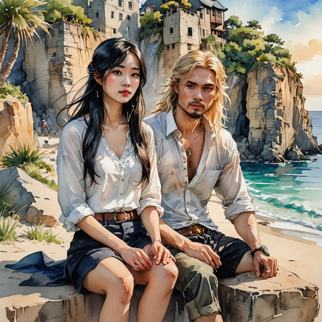 A watercolor sketch of a Chinese girl with big brown eyes sitting next to a blonde Irish pirate on a beach. A mermaid swims in the ocean under volumetric lighting.
