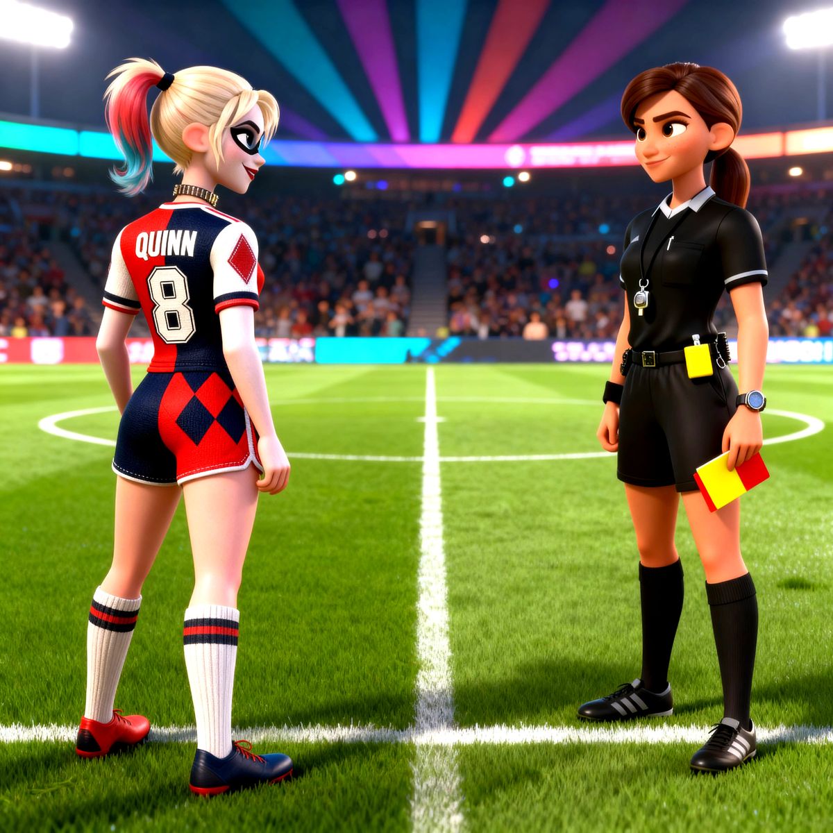 This CGI image shows Harley Quinn and a referee in profile during an evening stadium soccer match. The scene features realistic pitch markings and blurred crowd silhouettes.