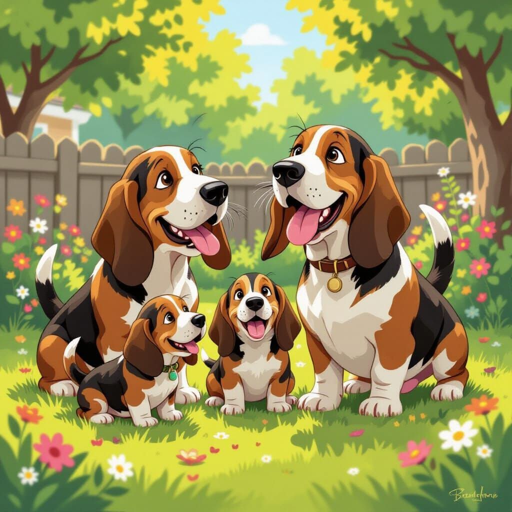 A heartwarming cartoon of Basset Hounds playing in a sunny yard. Features textured dots and uplifting colors, capturing playful energy and parental love.