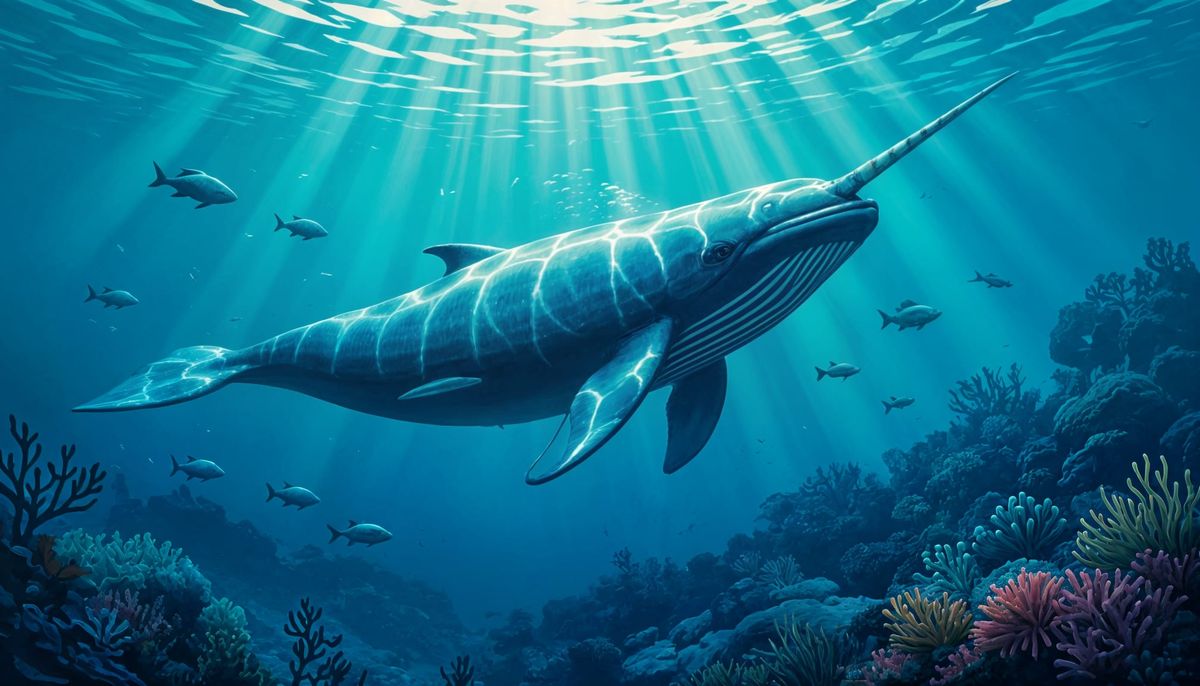 This image shows a narwhal swimming among undersea plants and animals. The digital painting features vibrant colors, ambient lighting, and intricate details reminiscent of classical animal portraits.