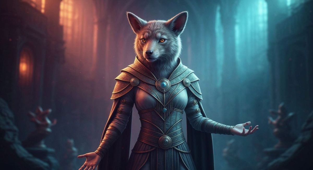 This image shows a human-animal hybrid in elaborate, mystical clothing. The backdrop is dramatic and cinematic, rendered with sharp focus and high contrast to create an atmospheric, hyperrealistic scene.