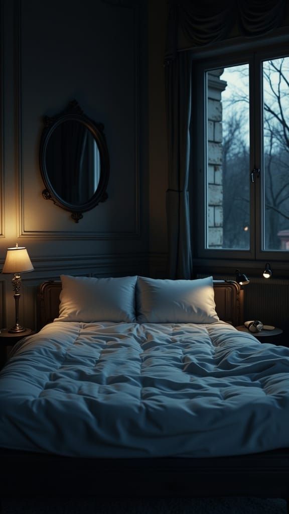 This image shows a romantic bedroom scene bathed in moonlight, featuring an empty bed and a mirror casting soft shadows. The modern loft setting evokes an elegant and mysterious mood.