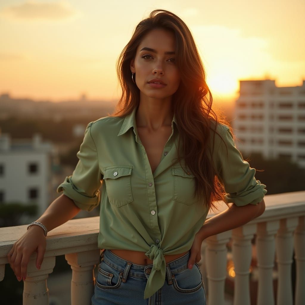 A realistic portrait of a beautiful Argentine woman standing on a balcony at sunset. The image captures her natural beauty with soft, flattering lighting and a focus on realistic details.