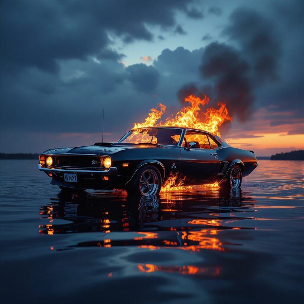 This image showcases a hyperrealistic, cinematic scene of a vintage muscle car ablaze on dark water. Dramatic lighting highlights the fiery vehicle and its reflection against a stormy twilight.
