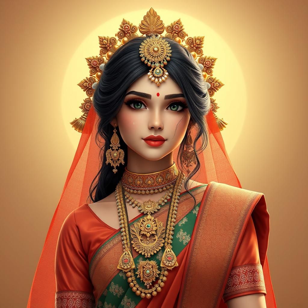 A striking picture of a beautiful Indian woman wearing modern glasses and traditional clothing. She is sitting in front of an ancient Hindu temple in a 3D rendered anime style.