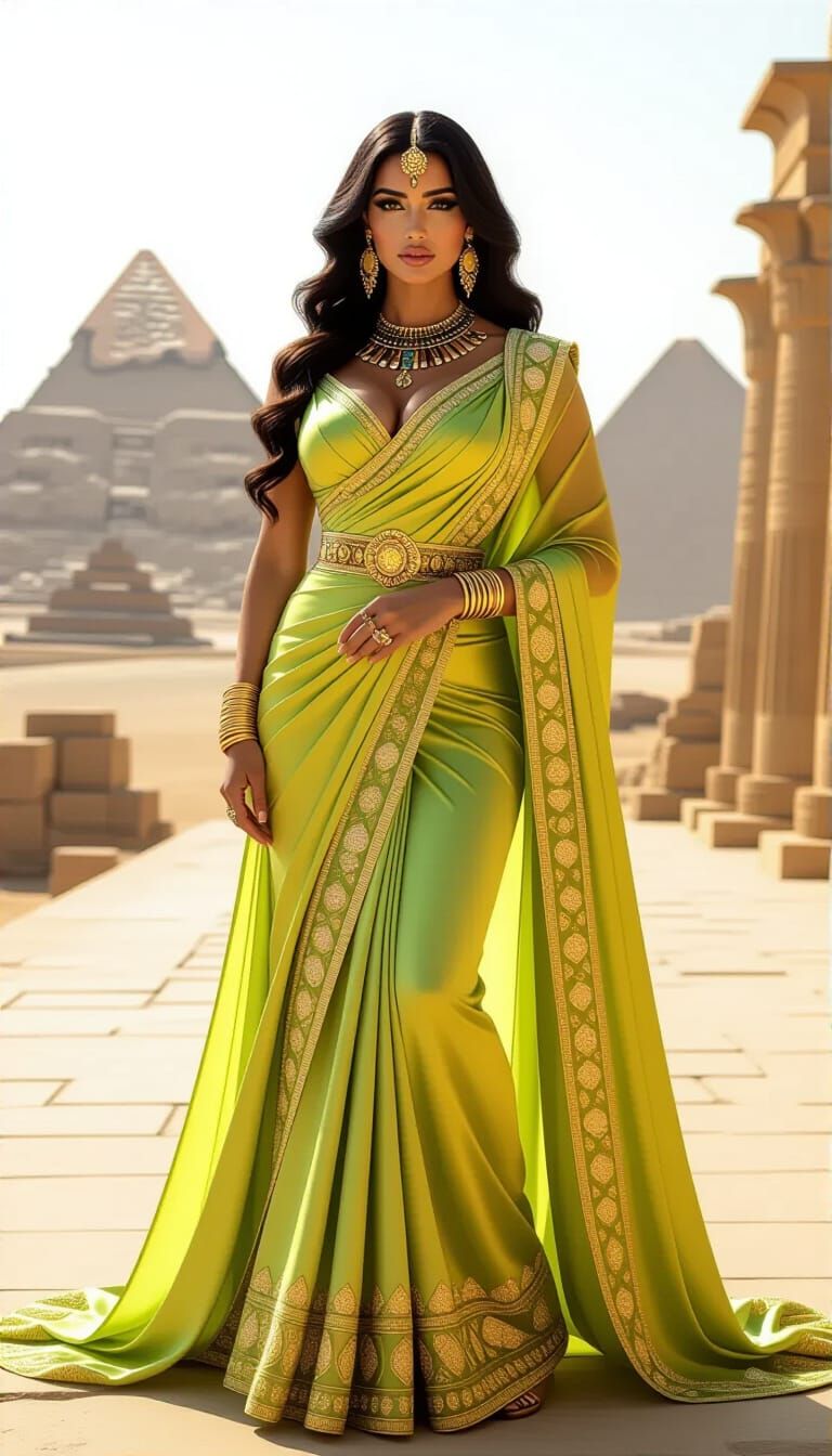 This image depicts a curvy goddess in a gold and light green gown with embroidery, standing before Egyptian temples. Shot with cinematic lighting, it evokes a high-fashion aesthetic.