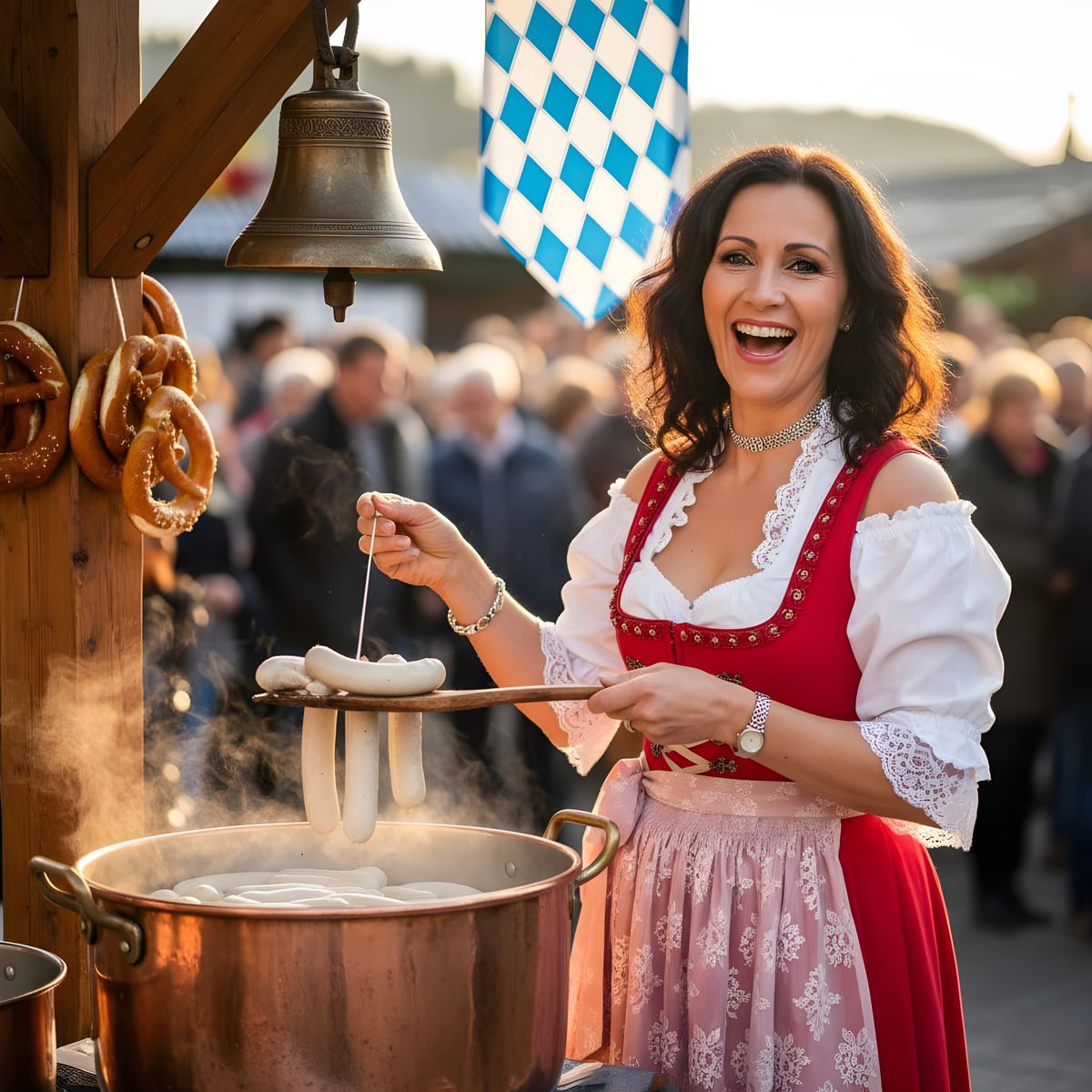 This image shows a happy woman in a red dirndl with lace accents, holding sausages. The festive scene includes pretzels and a checkered flag, evoking traditional Bavarian celebration.