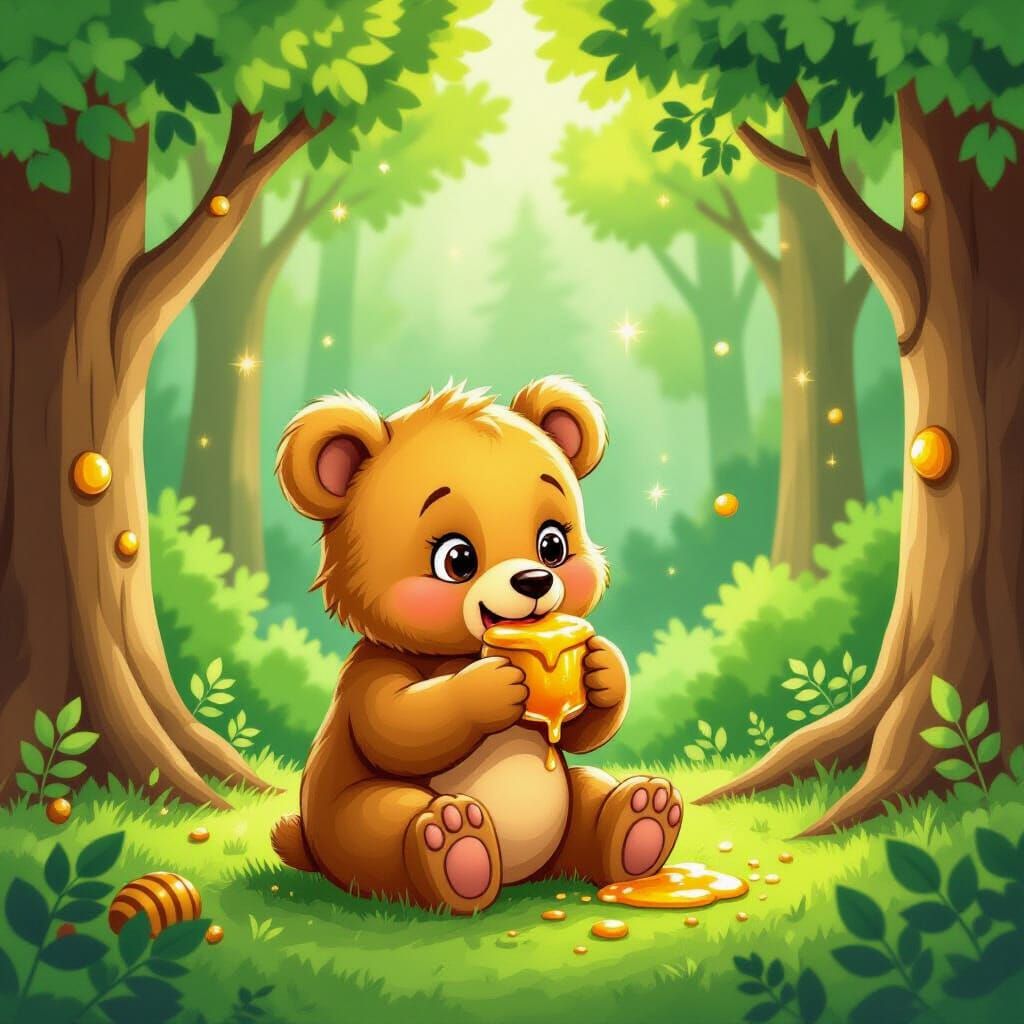 This image shows a golden bear cub enjoying golden honey in a verdant forest with gold-tinged trees. The illustration evokes an enchanting storybook aesthetic, full of dynamic energy.