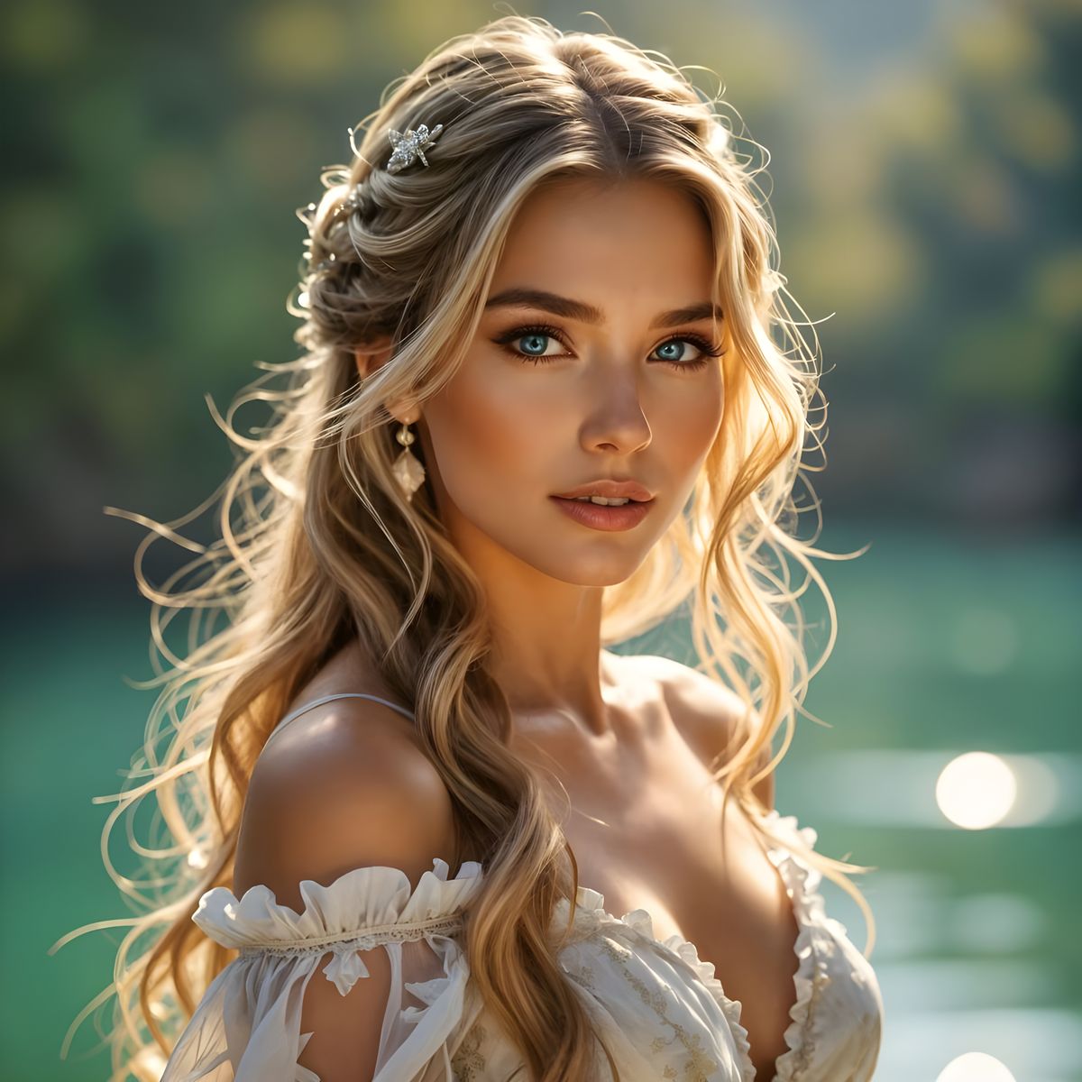 A surreal image of a woman with long, shimmering blonde hair. Ethereal lighting and dreamlike qualities create a captivating and detailed scene, rendered in high resolution.