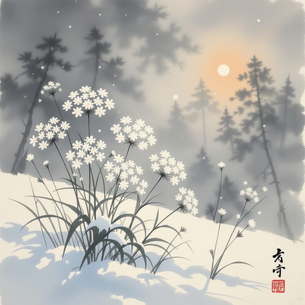 This image shows Queen Ann's Lace blooming amidst fresh snow, with heat rising in the background. The artwork is inspired by Japanese minimalism, using oil and graphite on sketchboard, with Sumi-e influences for a serene and delicate feel.