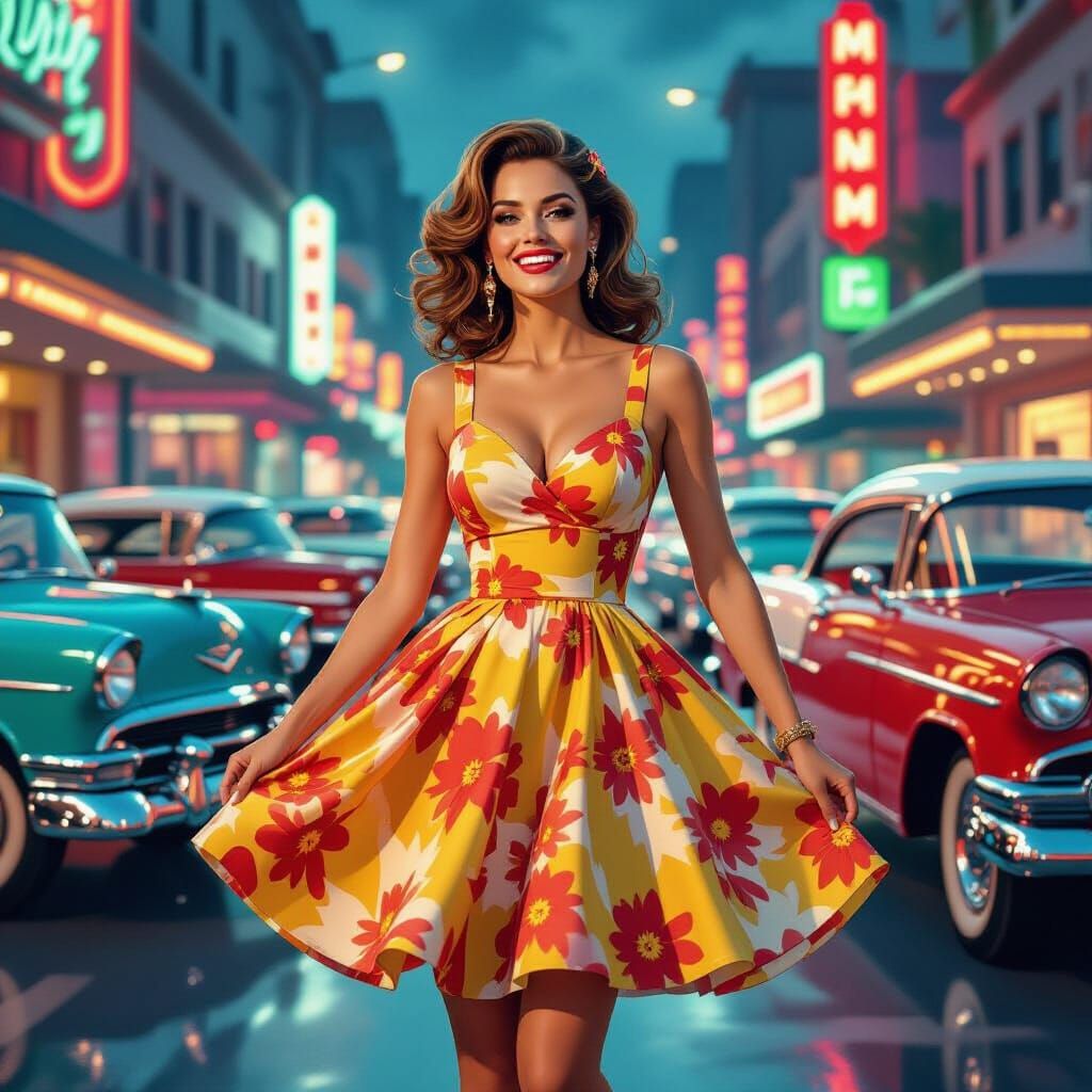 This image shows Miss Molly, a vibrant woman in a colorful dress, set against a nostalgic 1950s backdrop. The photorealistic image features vintage cars and neon lights.