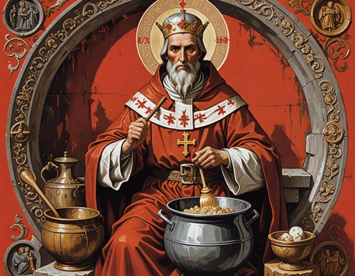 This image shows a medieval monk stirring a large pot while seated on a giant six-sided die. The background features the red and white colors of Poland with a crowned eagle emblem.