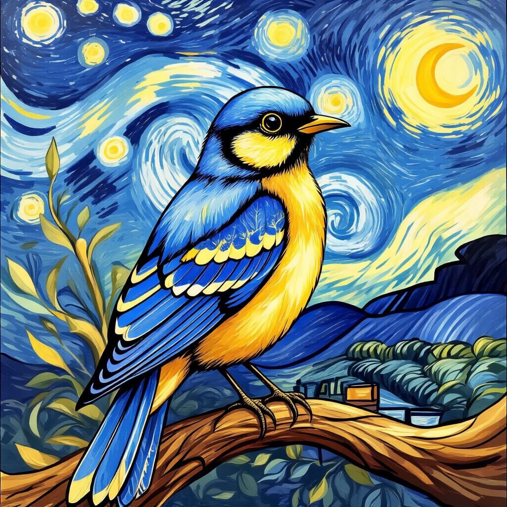 A vibrant image of a bird with swirling, colorful feathers. The painterly style evokes Van Gogh's Starry Night, rendered with dynamic brushstrokes in blues and yellows.