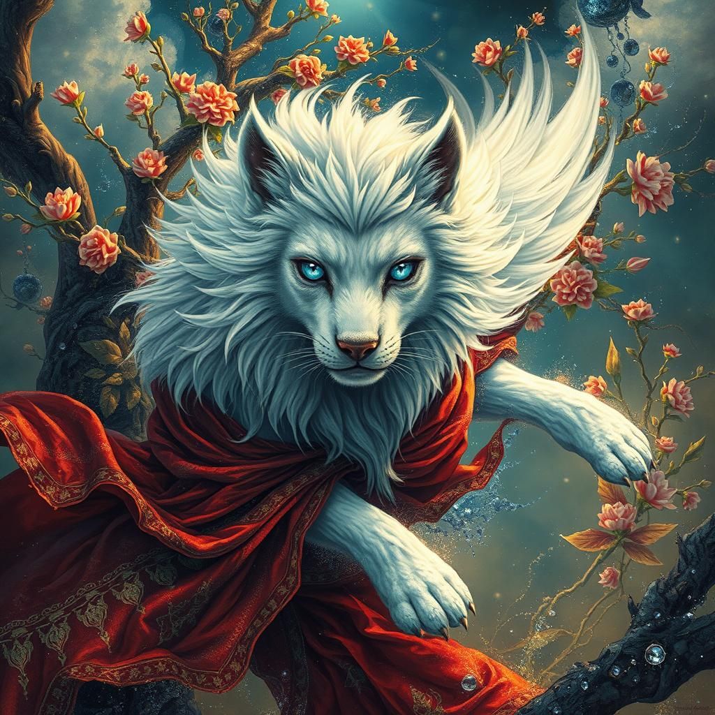 A surreal image of a white-haired astral being soaring through a cosmic sea. The figure wears a shimmering red cloak and is surrounded by a radiant tree branch in this surrealist scene.