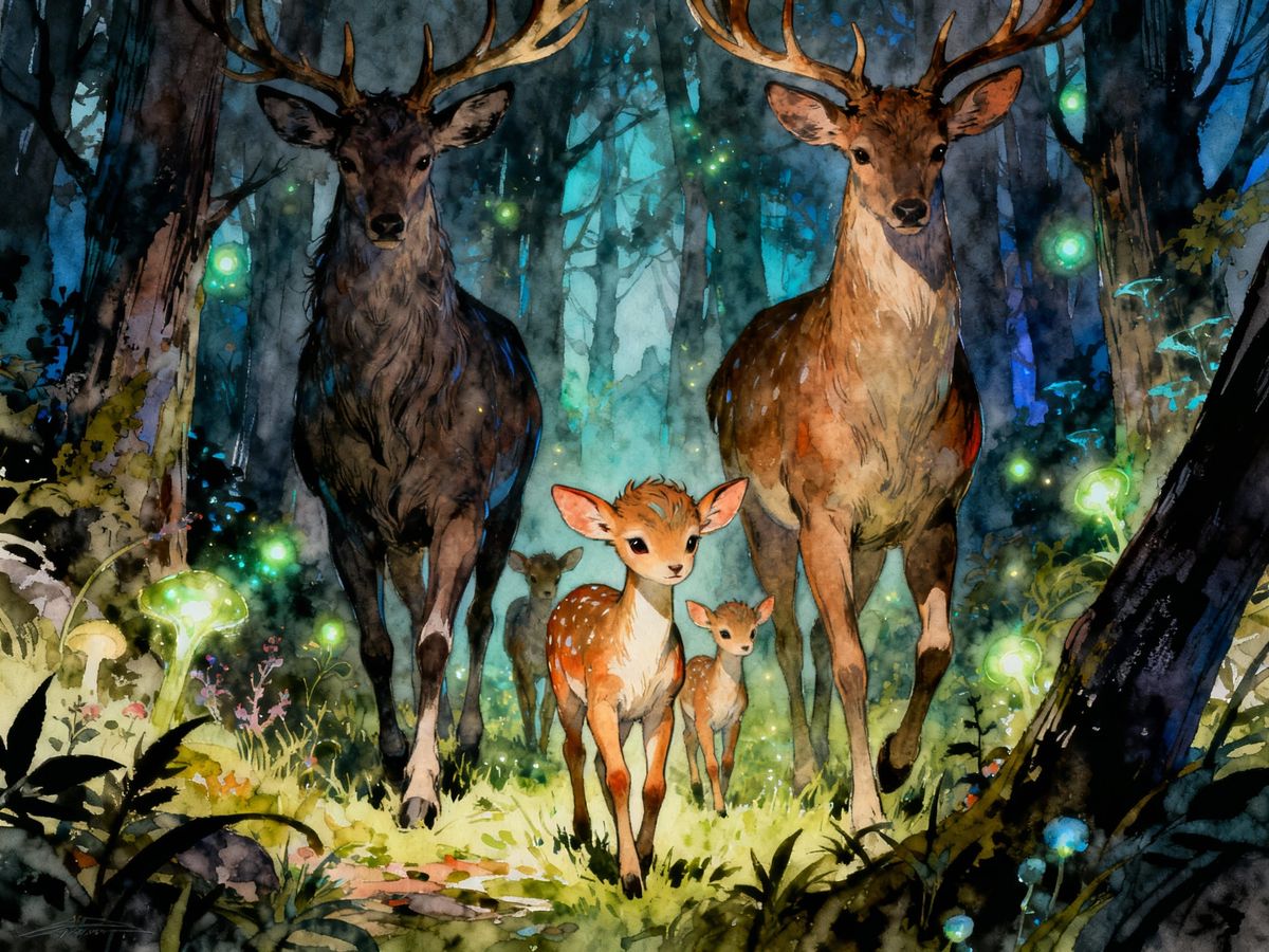 in the minimalist illustrative style of pascal campion, BakaArts, Rlonart, sable, Supergiant Games :: Dark comic style, Water color High Gothic, Ethereal, Otherworldly, Hyperdetailed, sublime, detailed, Majestic Close-up depiction of baby fauns with their faun parents walking in the forest together, ...